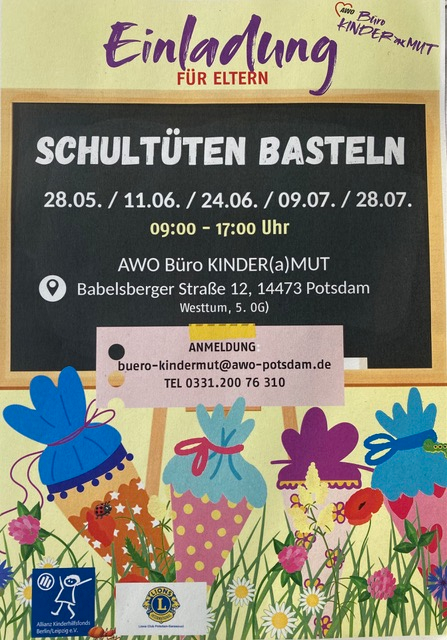 Eine gute Gelegenheit für uns Lions, mit den betreffenden Eltern in Verbindung zu treten, sind die anstehenden Termine zum Schultüten basteln. Start ist Mitte Mai, Juni, bis Anfang Juli. Die Termine werden rechtzeitig bekannt gegeben (BG).