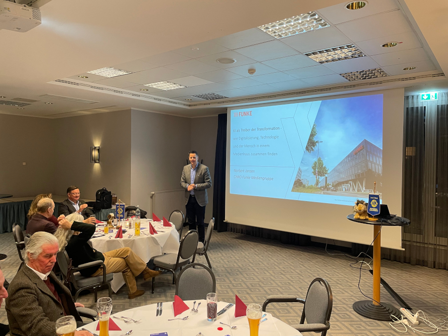 Der Clubabend Februar stand ganz im Zeichen von KI-Anwendungen und deren Auswirkungen auf die Prozesse in Unternehmen und die Mitarbeitenden. Unser Präsident, Michael Dimde, hatte dazu einen hochrangigen Gastredner eingeladen. Der Leiter der Abteilung Human Resources und Chef des Personalmanagements der FUNKE Mediengruppe, Norbert Janzen, veranschaulichte uns am Beispiel seines Unternehmens, welche Einflüsse KI heute und zukünftig für die FUNKE Mediengruppe haben wird. KI ist Treiber von Transformationsprozessen, neue Berufsbilder entstehen und heutige Arbeitsabläufe werden sich stark verändern. Nach einer lebhaften Diskussion dankte unser Präsident dem Vortragenden für die interessanten Einblicke und Ausblicke. (RC)