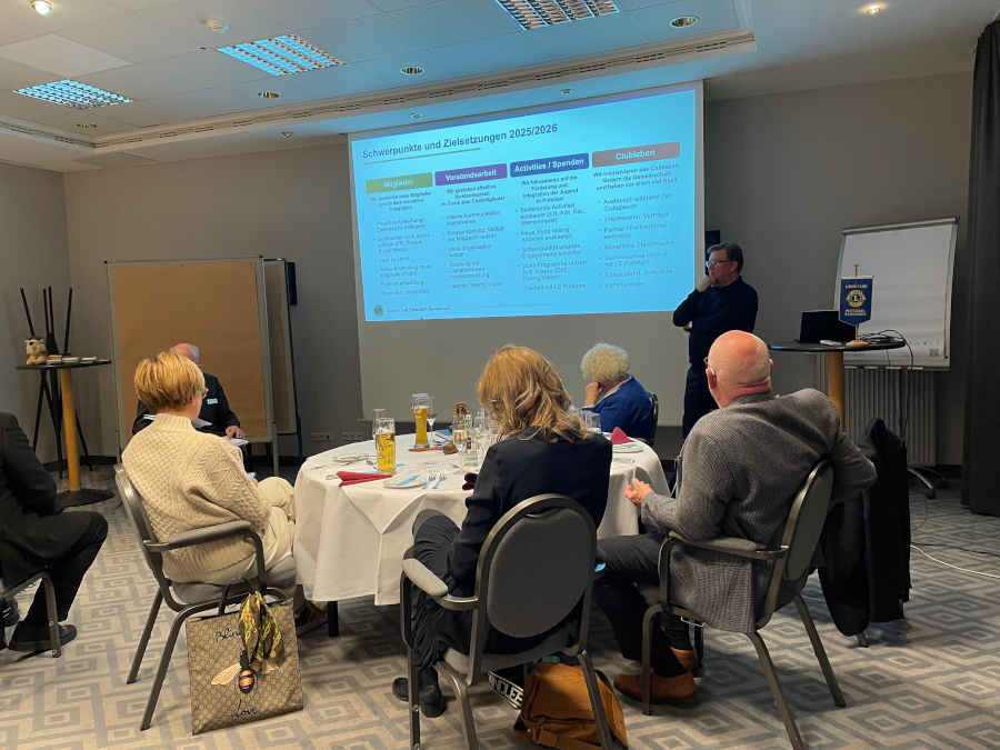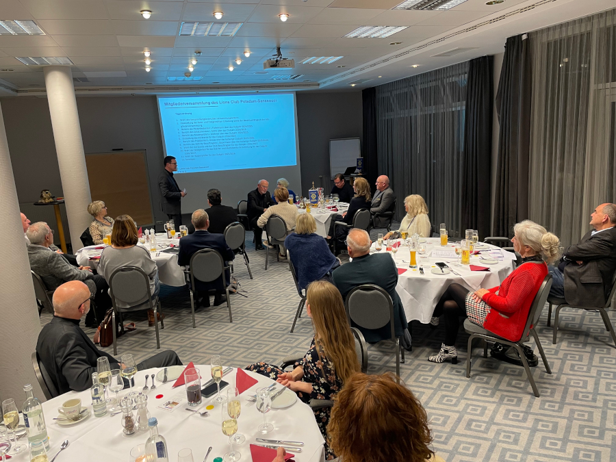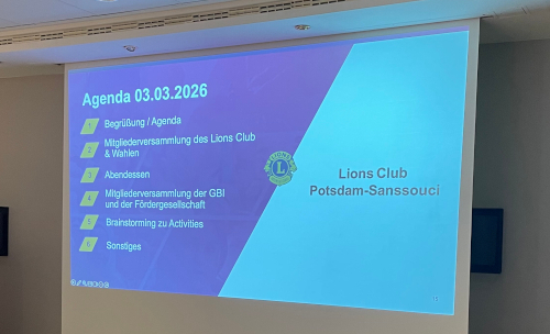 Am 03. März trafen sich die Clubmitglieder zu den jährlichen Mitgliederversammlungen von Club, Fördergesellschaft und Gesellschaft für Bildung und Integration (GBI) im MAXX Hotel Sanssouci Potsdam. Unser Präsident, Michel Dimde, begrüßte die Lions und gratulierte als erste "Amtshandlung" unserem Lionsfreund Edgar Chatupa, der an diesem Tag Geburtstag hatte. Es folgten die Regularien der Mitgliederversammlung des Clubs mit der Wahl des Versammlungsleiters und den Berichten der Amtsträger zu ihren Bereichen. Danach stimmten die Mitglieder über die Entlastung des Vorstandes für das Clubjahr 2024/2025 ab. Anschließend wurden der neue Vorstand sowie die Beauftragten für das Clubjahr 2026/2027 gewählt. Nach dem gemeinsamen Abendessen waren die Mitgliederversammlungen von Fördergesellschaft und GBI an der Reihe. Eine Vorschau auf die nächsten Veranstaltungen und Activities rundeten den Abend ab. (RC)