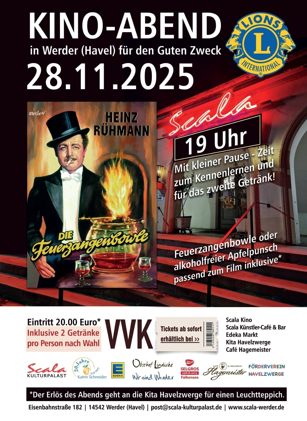 Am 28. November 2025 hat der Lions Club Potsdam-Sanssouci im Scala-Kino in Werder den Film „Die Feuerzangenbowle“ vorgeführt. Im Eintrittspreis waren zwei Becher Feuerzangenbowle oder alkoholfreier Apfelpunsch enthalten.
